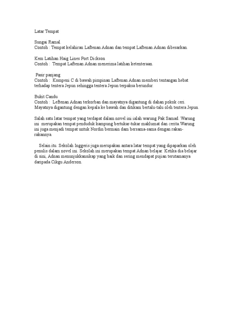 Anda boleh merujuk kepada nota novel termasuklah tema persoalan sinopsis binaan plot teknik plot watak perwatakan latar tempat latar masa latar masyarakat gaya bahasa nilai dan pengajaran. B Masyarakat yang memiliki keberanian yang luar biasa. Masyarakat yang patriotik Leftenan Adnan bersama Askar-Askar Melayu yang lain berjuang mati-matian mempertahankan negara.